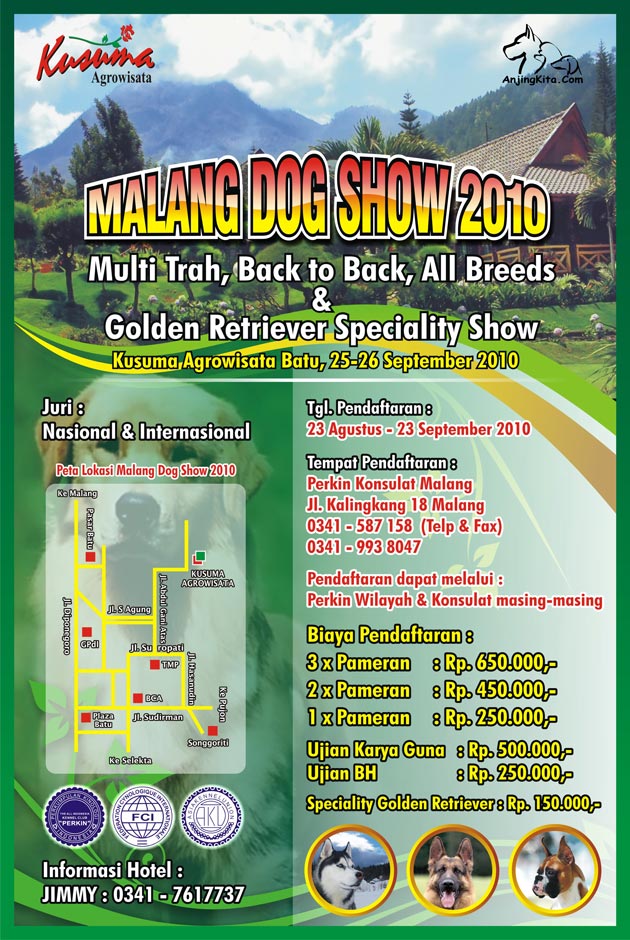 Perkin Konsulat Malang menggelar pameran anjing trah all breed, multi trah dan speciality pada 25 & 26 September 2010 di Kusuma Agro Wisata Batu - Malang.