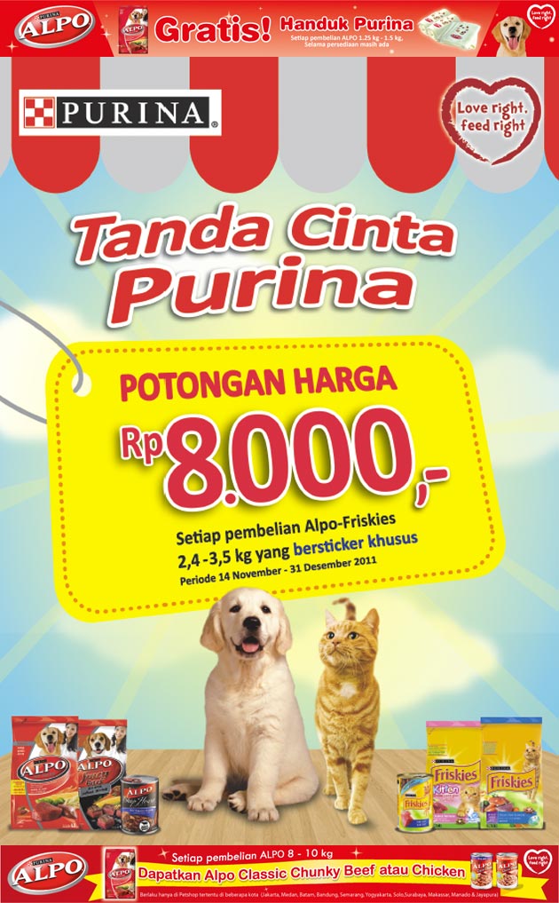 Dapatkan potongan harga senilai Rp.8.000,- untuk setiap pembelian Alpo-Frieskies kemasan 2,4 kg - 3,5 kg yang bersticker khusus selama periode 14 November - 31 Desember 2011.