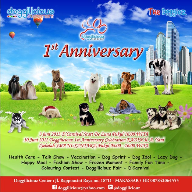 1st Aniiversary Doggiliciouz Indonesia akan melibatkan anak – anak playgroup ( TK ) dan anjing – anjing dari berbagai macam ras dengan sederet rangkaian kegiatan yang menarik. Sehingga acara ini bisa dijadikan sebagai ajang berkumpulnya anjing- anjing di Makassar dan sekitarnya, tempat bertemunya penggemar dan pemerhati anjing, sekaligus merupakan Aset Pariwisata bagi kota Makassar itu sendiri nantinya.