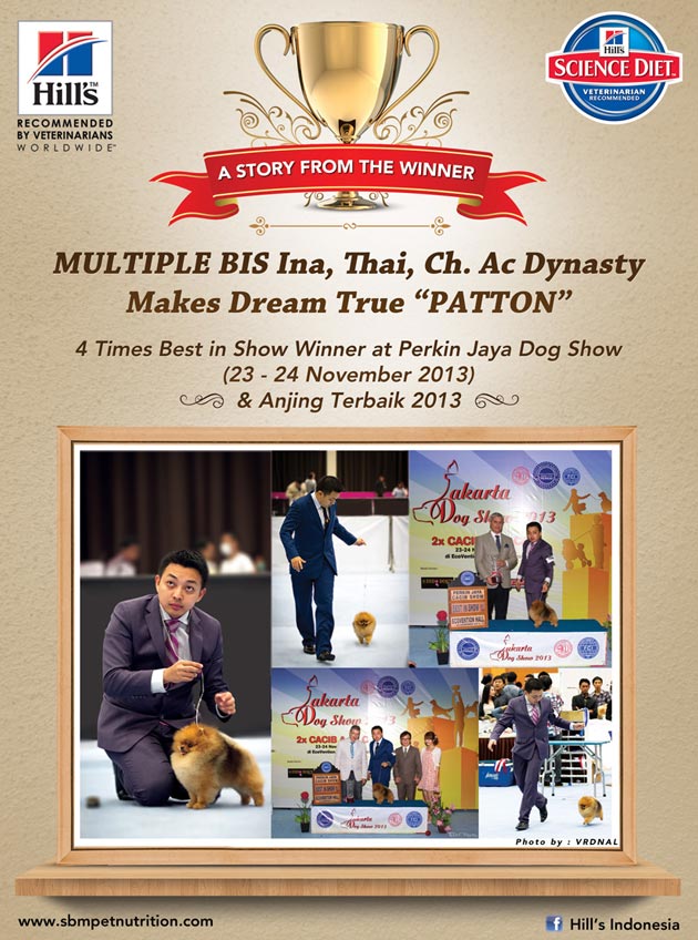 Suherman Hartanto yang biasa akrab dipanggil dengan panggilan Suho adalah pemilik dari MULTIPLE BIS Ina, Thai, Ch. Ac Dynasty Makes Dream True “PATTON”, pomeranian yang telah memenangkan Juara BEST IN SHOW 4 times in a row dalam Perkin Jaya Dog Show (23-24 November 2013) di Ecopark, Ancol. Sungguh pencapaian yang luar biasa dan patut diacungkan jempol karena bukan hanya menjadi Juara BEST IN SHOW 4 kali berturut-turut tetapi Patton juga berhasil menyandang predikat Anjing Terbaik 2013 – No. 1 Dog 2013.