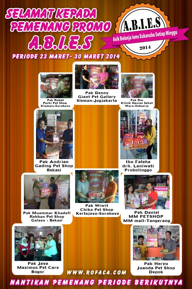 Selamat kepada pemenang promo A.B.I.E.S (Asik Belanja Iams Eukanuba Setiap Minggu) periode 23 Maret - 30 Maret 2014