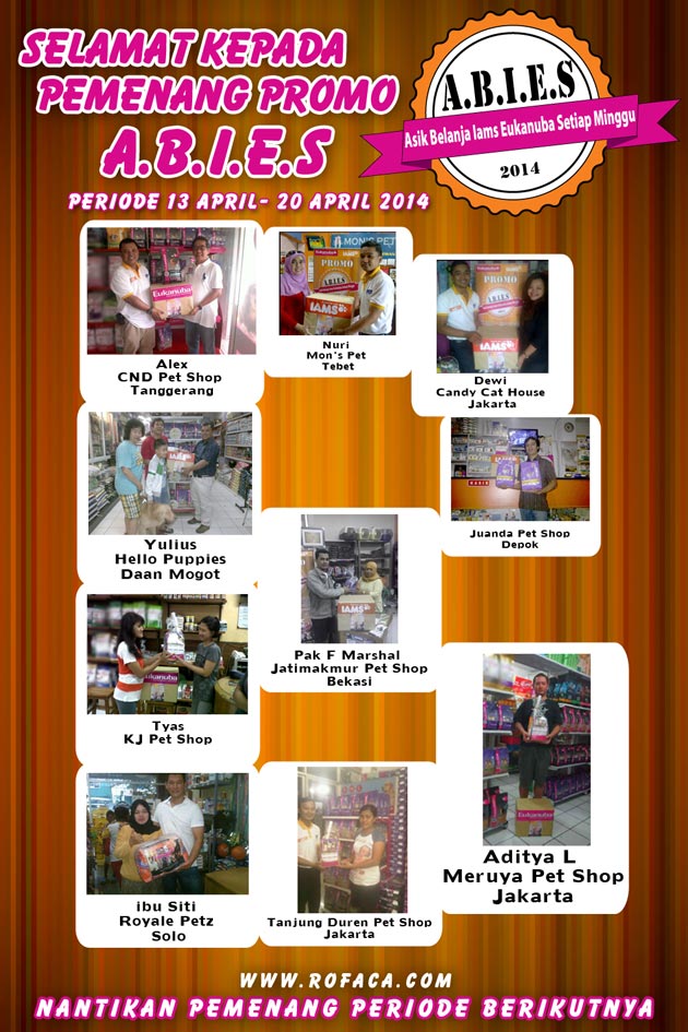 Selamat kepada pemenang promo A.B.I.E.S (Asik Belanja Iams Eukanuba Setiap Minggu) periode 13 April - 20 April 2014