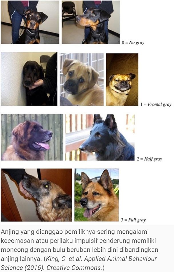 “Anjing yang dianggap pemiliknya sering mengalami kecemasan atau perilaku impulsif cenderung memiliki moncong dengan bulu beruban lebih dini dibandingkan anjing lainnya,” ungkap peneliti utama studi, Camille King.
